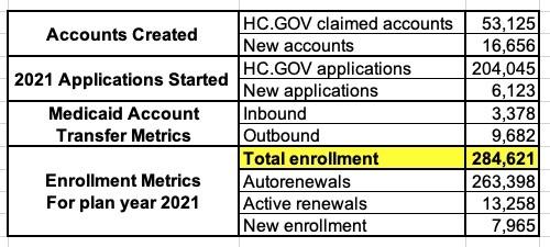 - 98% of the 208,500 enrolled households were eligible to be renewed into 2021 plans