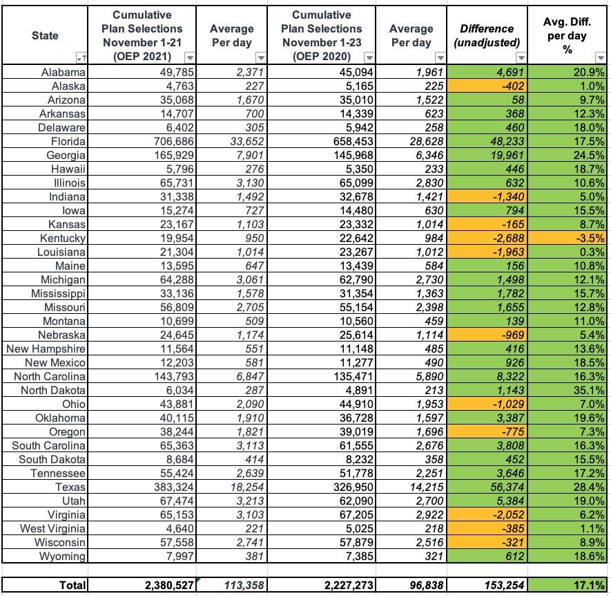 - First 21 days of OEP 2021: 113,358 QHP selections/day (2,380,527 total)
