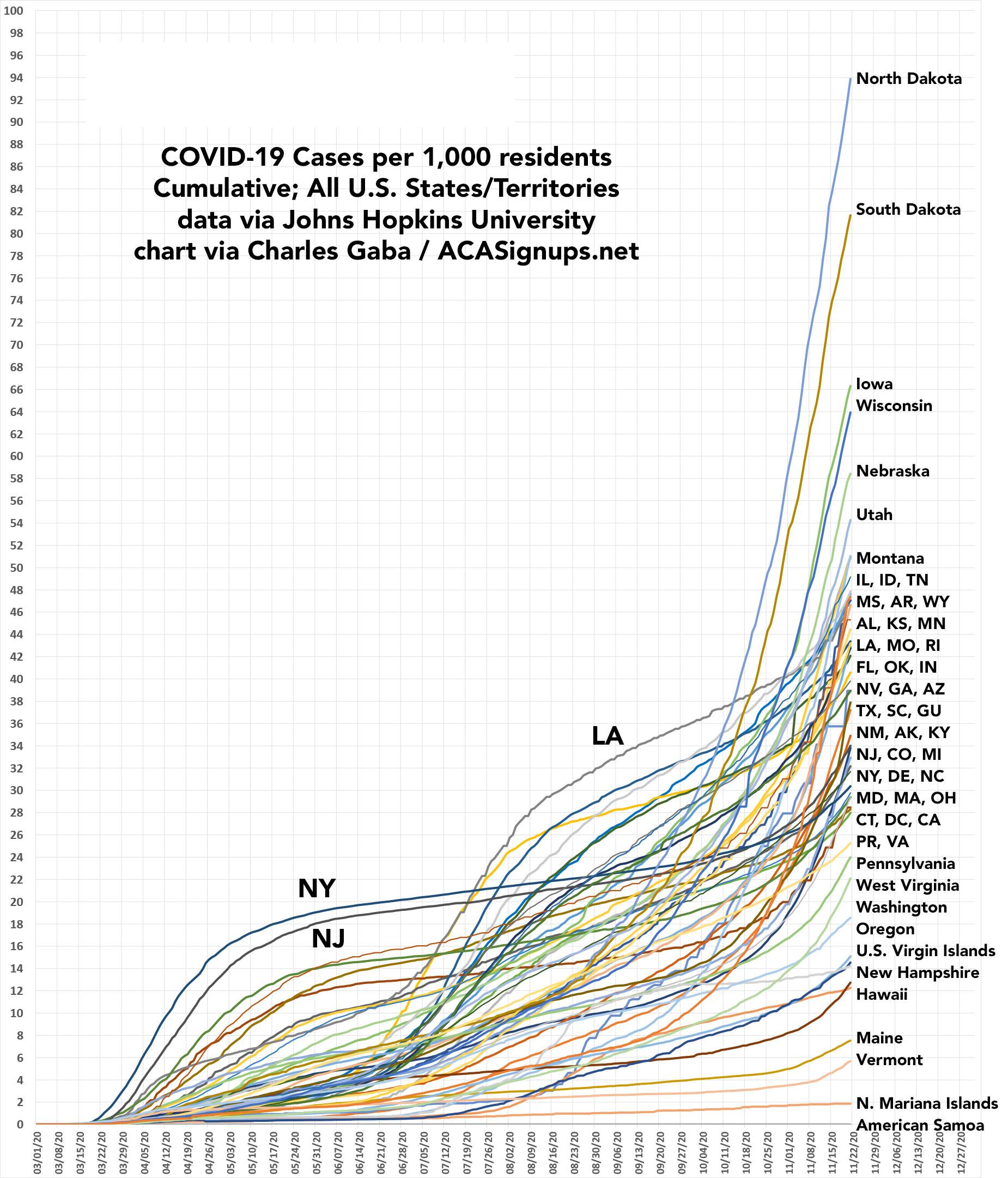 I've done my best to label every state/territory, which obviously isn't easy to do for most of them given how tangled it gets in the middle. The most obvious point is that New York and New Jersey, which towered over every other state last spring, are now utterly dwarfed by North & South Dakota, which are skyrocketing.