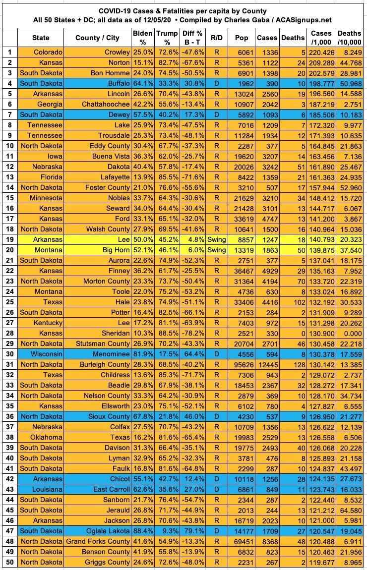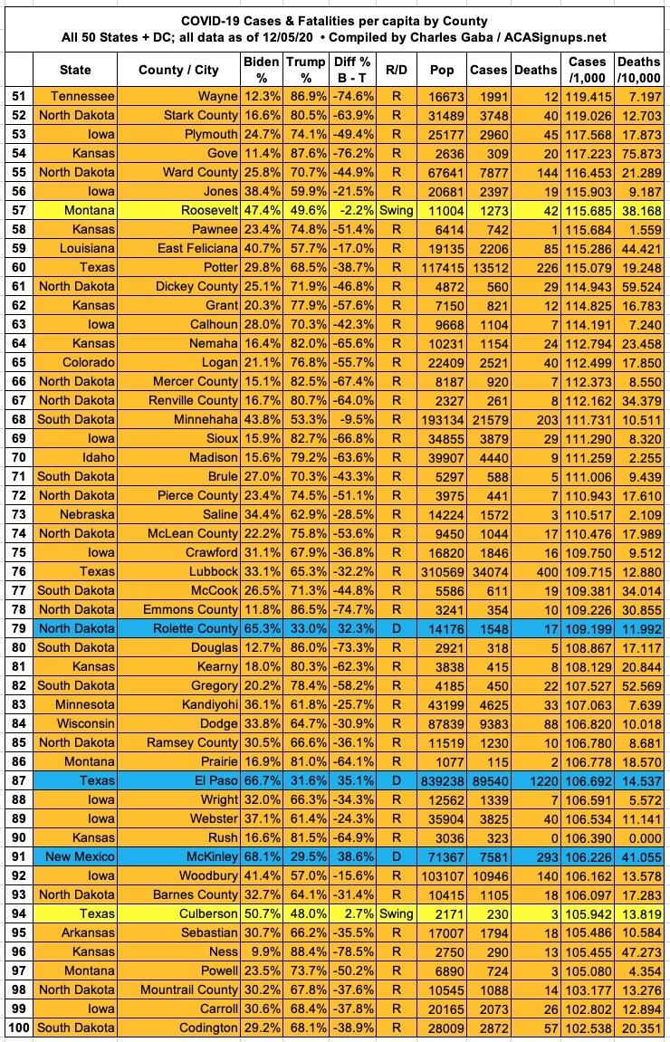 Here's the top 100 counties ranked by per capita COVID-19 fatalities as of Saturday, December 5th (click image for high-res version):