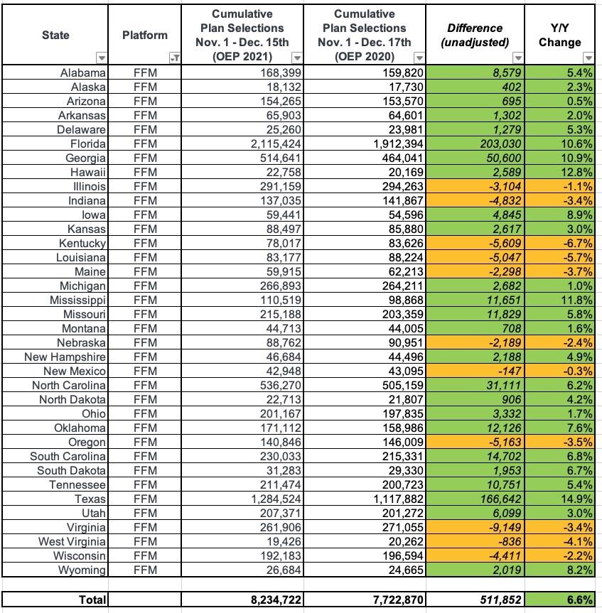 This snapshot covers the period from December 6, 2020, to 11:59 p.m. Eastern on December 15, 2020. The plan selections reported in this snapshot are not final and do not include plan selections for consumers who enrolled in coverage between 12:00 a.m. and 5:00 a.m. Eastern on December 16, 2020, or consumers who left their contact information at the call center due to high volume. Similar to previous years, the Centers for Medicare & Medicaid Services (CMS) plans to release an updated snapshot during the second week of January with the final enrollment data.