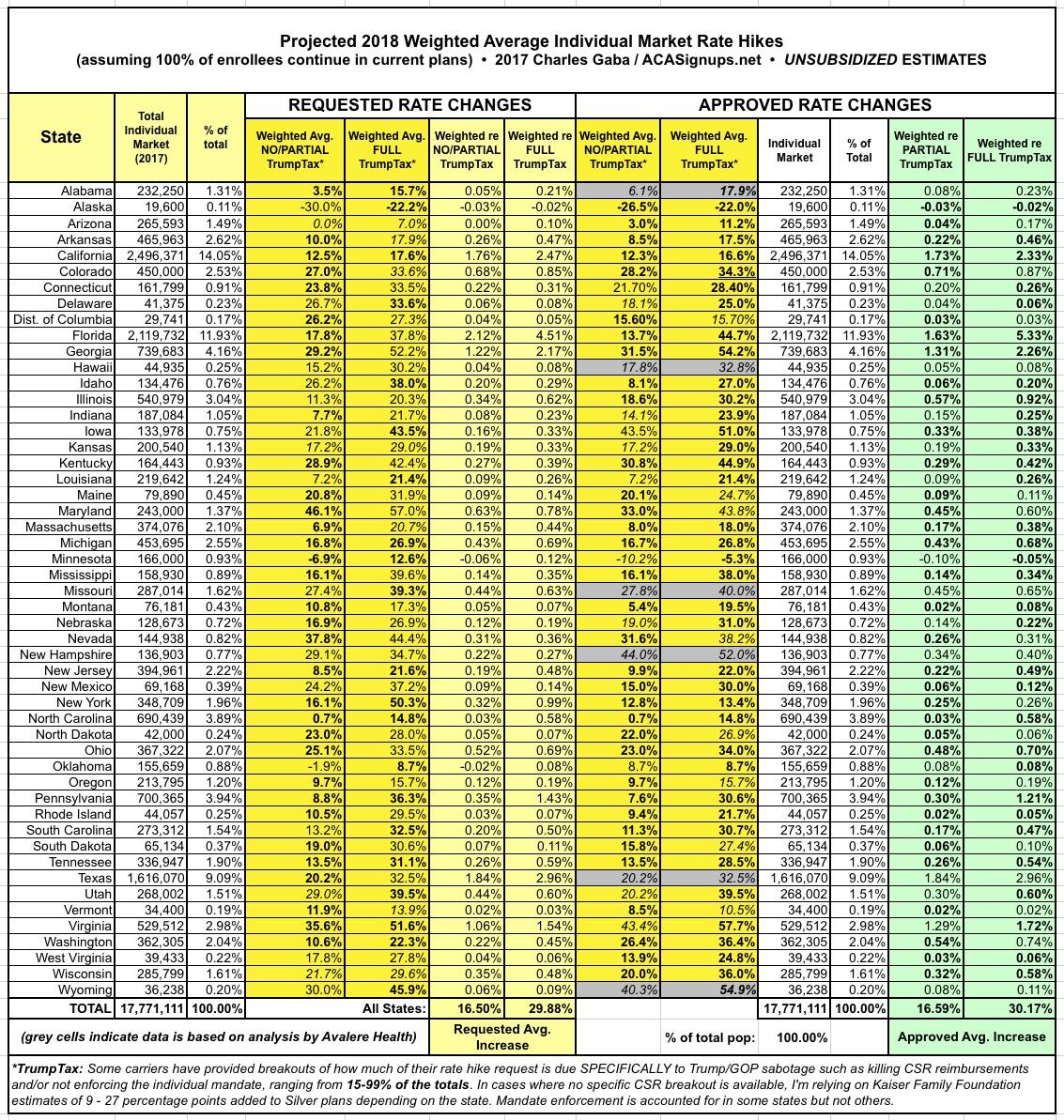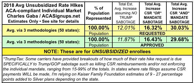UPDATE 8/1/17: Well, the floodgates have really opened up today (especially with RateReview.HealthCare.Gov being loaded up for 2018). I've also added ALABAMA, ALASKA and WYOMING. Across 28 states representing I've now tracked 28 STATES representing 53% of the population, with weighted average requested rate hikes of up to 13.2% with NO or PARTIAL Trump/GOP sabotage included, or around 28.1% with the FULL sabotage tax: