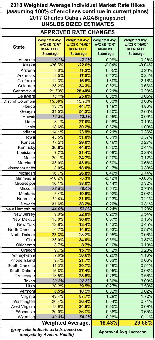 With approved rates for 6 states now baked in, the "partial sabotage" average stands at 19.4% while the "full sabotage" average is 24.1%...several points higher and lower respectively, with CSR sabotage "only" accounting for about 20% of the average increase. However, it's very important to remember that these states only represent about 9% of the total population; both numbers will almost certainly jump around quite a bit as more states are added to the mix, just as they did when I started adding requested rate changes in.