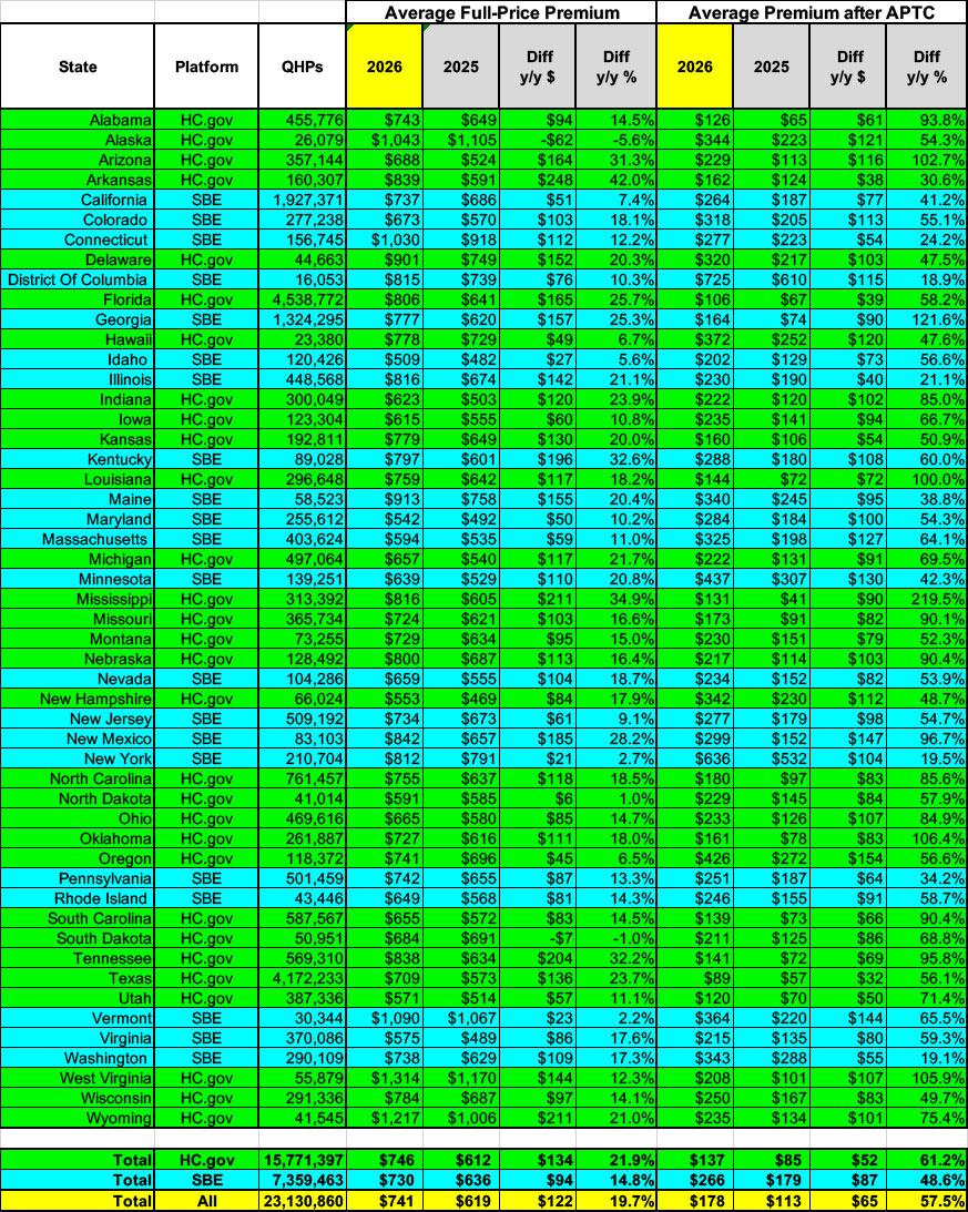 It's worth noting that 9 of the 10 states with the lowest average net premium increases are blue states: DC, WA, NY, IL, CT, PA, ME, CA & MN, with Arkansas being the sole exception (presumably due to their newly-implementing robust Premium Alignment this year, as did both WA & IL). None of these went up by more than 42% (which is still pretty bad, of course).