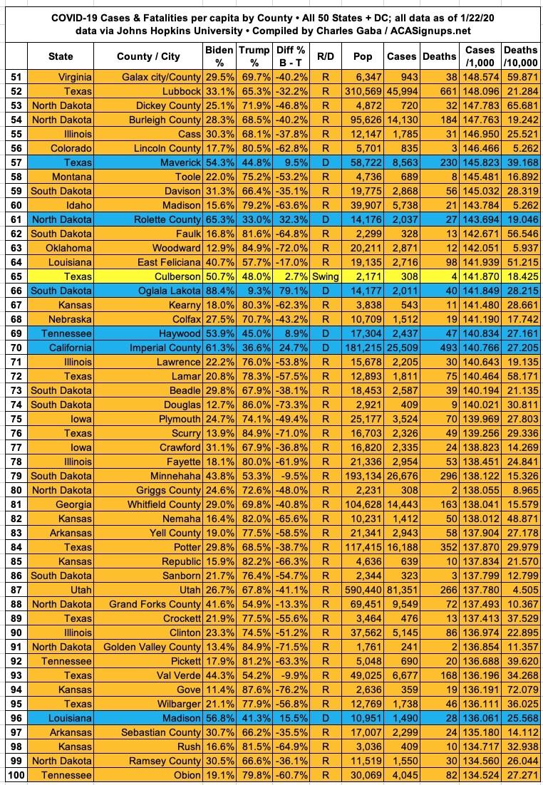 Here's the top 100 counties ranked by per capita COVID-19 fatalities as of Friday, January 22nd, 2021 (click image for high-res version):