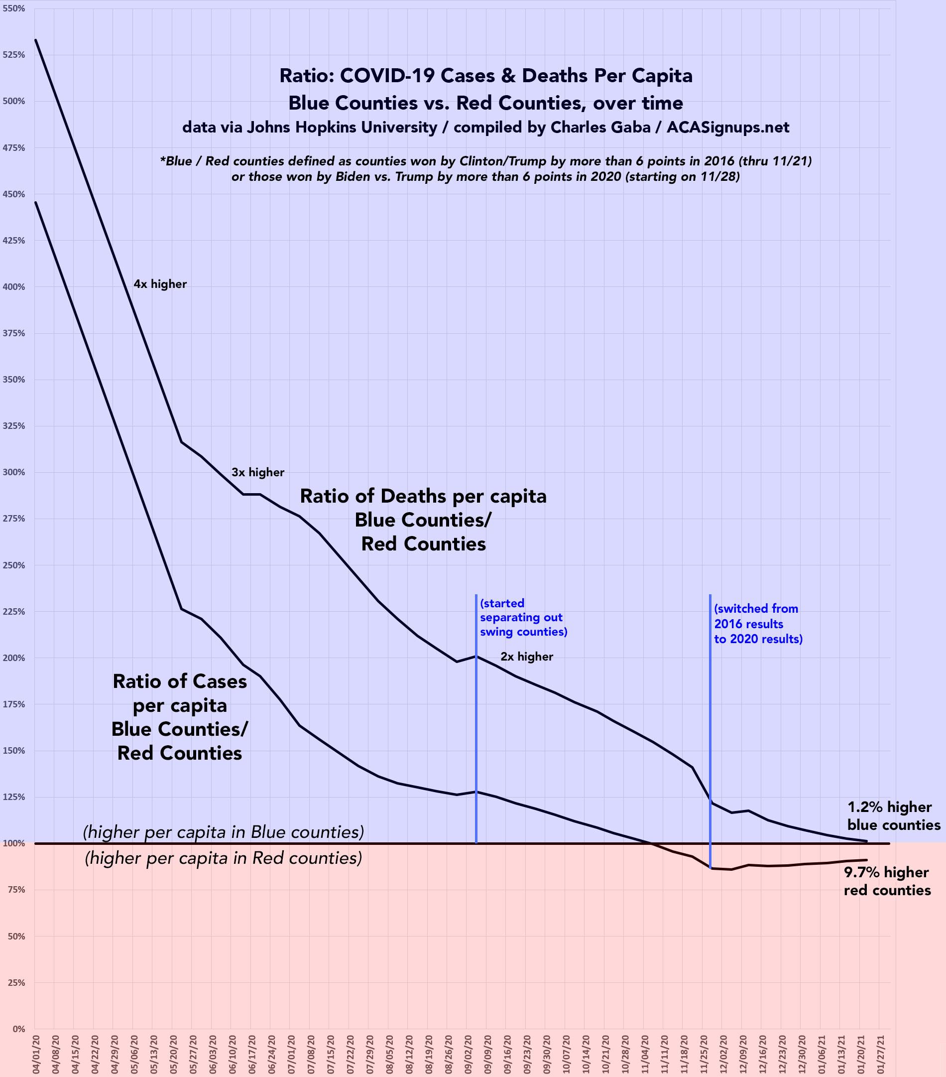It's also worth noting how the ratio of per capita cases and mortality have shifted between the Blue and Red-leaning counties over time.