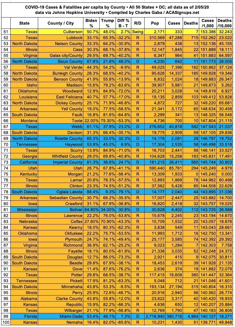 Here's the top 100 counties ranked by per capita COVID-19 fatalities as of Friday, February 5th, 2021 (click image for high-res version):