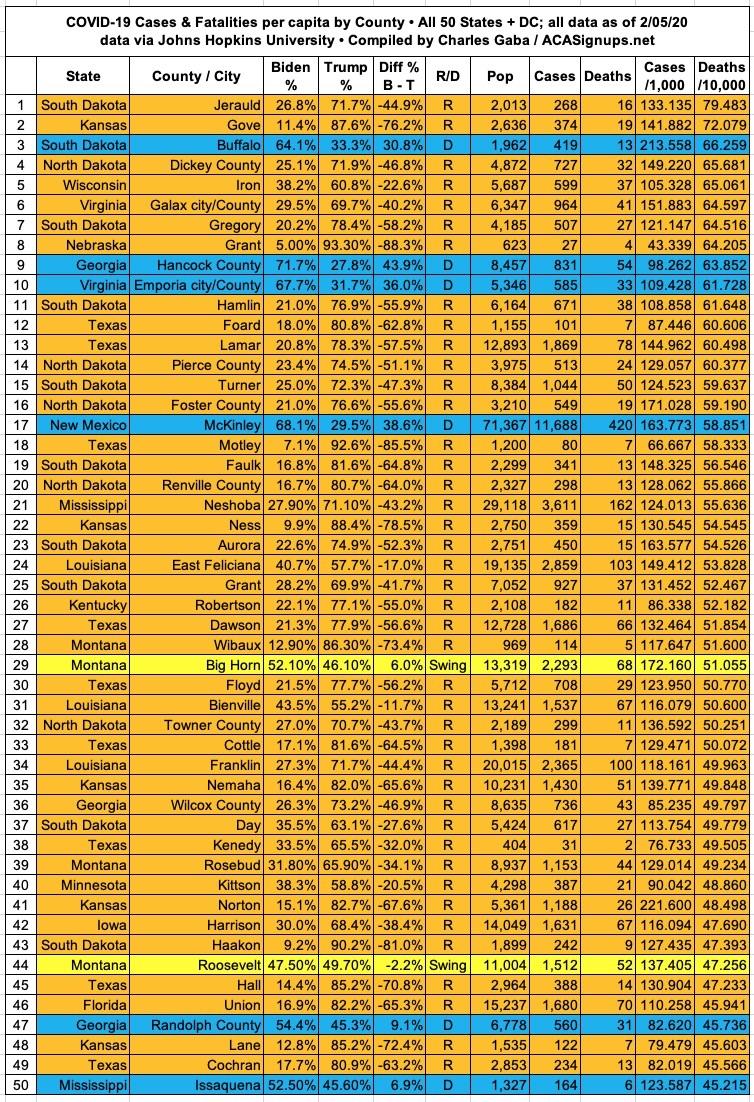 The #1 spot is still Jerauld County, South Dakota, where 16 out of the county's 2,013 residents have died of COVID-19, or 0.8%. That's 1 out of every 125 residents.