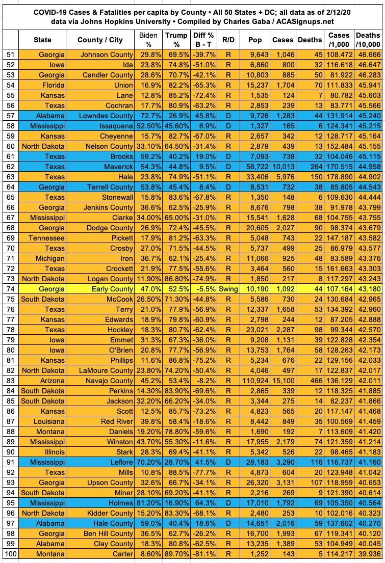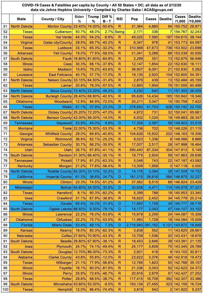 Here's the top 100 counties ranked by per capita COVID-19 fatalities as of Friday, February 12th, 2021 (click image for high-res version):