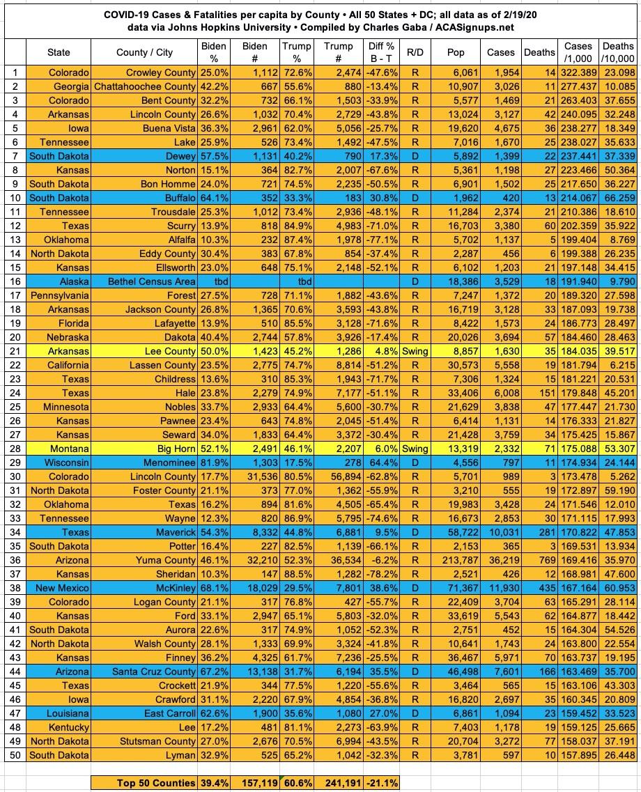 Here's the top 100 counties ranked by per capita COVID-19 fatalities as of Friday, February 19th, 2021 (click image for high-res version):