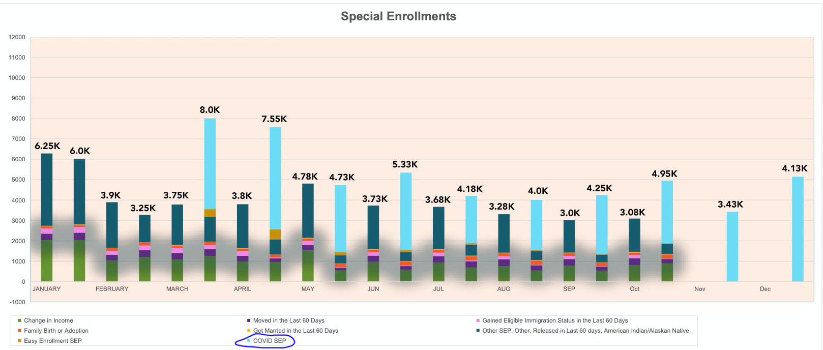 As far as I can tell, in January and February 2021, they're averaging around 63% more total SEP enrollments than they did for the first two months of 2020 (the light blue represents COVID SEP enrollments; the other colors represent other reasons people qualified, like getting married, losing their job, moving, etc):