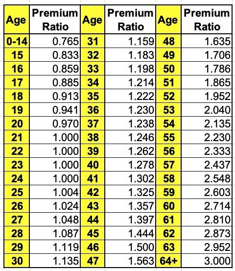 The essence of the problem remains the fact that there's a 3:1 pricing ratio limit between 64-yr olds and 21-yr olds even though the actuarial cost difference between the the two tends to be more like 5 or 6 to 1. Making this even more confusing is the fact that even that 3:1 age band isn't a straight line; that is, it doesn't hit 1.5x at 32 years old, 2.0x at 42, 2.5x at 53 and 3.0x at 64. The actual band looks more like this: