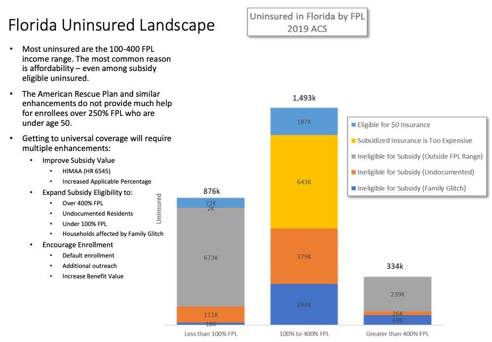 The key point from this slide is that in Florida, at least, 31% of the uninsured (890,000) are already eligible for current ACA subsidies, but haven't enrolled for various reasons...primarily affordability (or, for ~7% of the uninsured (187,000), a lack of awareness that they're eligible for FREE ACA policies right now).