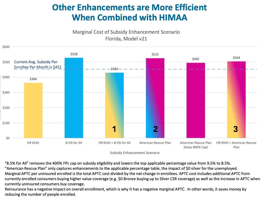 According to this analysis, in Florida, ARP/369 as it stands would increase the amount of subsidies spent per total exchange enrollee (including currently subsidized enrollees) by around 16%, which wouldn't be bad for a 19% increase in ACA exchange enrollment (I'm assuming 2.0 million is the baseline).