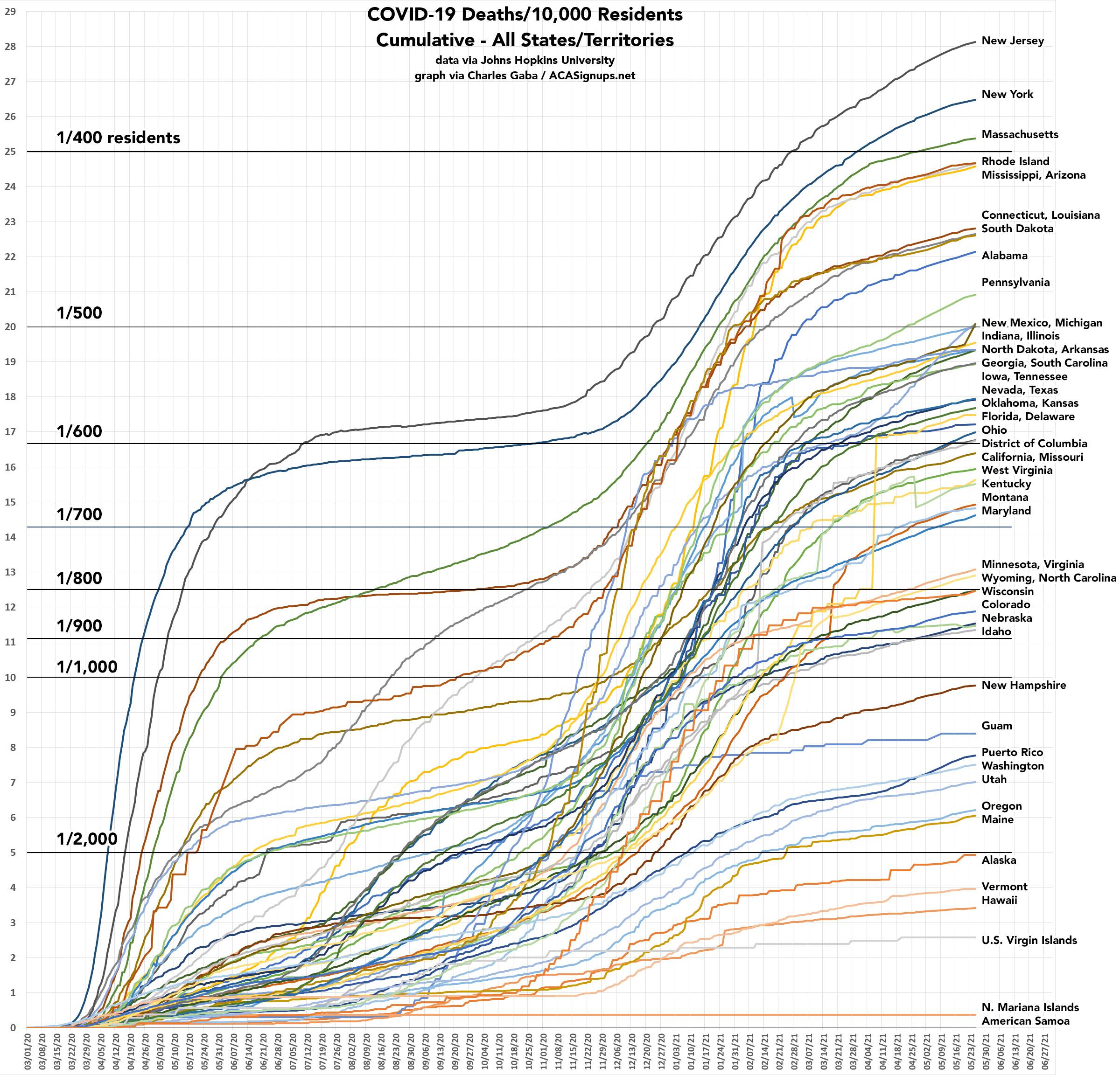 Next, let's look at the cumulative mortality rate for every U.S. state and territory. Here, New Jersey and New York are still worse than the rest of the country (primarily due to their mass deaths from March - May in spring 2020)...but as you can see, several other states have mostly caught up to them on this front.