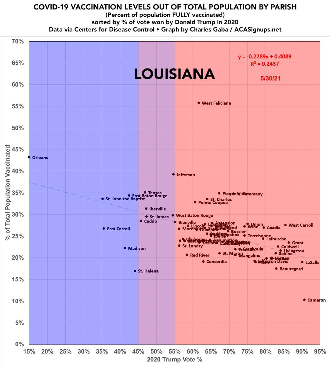 Louisiana: #COVID19 vaccination rates by parish & partisan lean