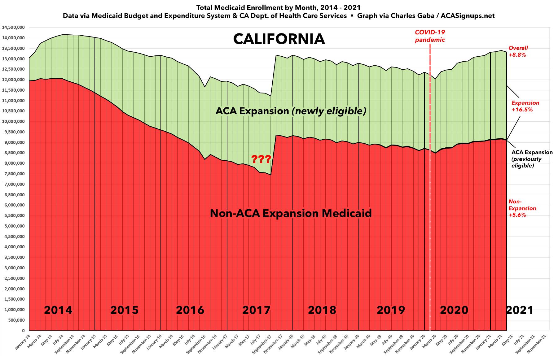 Since that October 2017 "reset" (?), Medi-Cal enrollment again gradually dropped off until early 2020...when, of course, the COVID-19 pandemic struck, throwing millions of people out of work and many of them into the Medicaid safety net. Unlike most states, however, California only saw a relatively modest Medicaid enrollment increase since last February, with non-ACA enrollment increasing just 5.6% and ACA expansion going up 16.5% for an overall Medi-Cal increase of 8.8% since the pandemic hit the shores of the United States.
