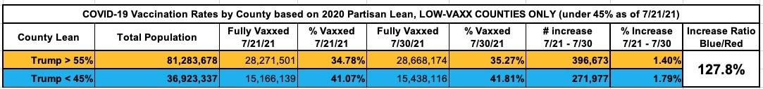On July 21st, I noted there were 146 low-vaxx Blue counties with 36.9 million residents and 2,103 low-vaxx Red counties with 81.3 million residents which fell below the 45% vaccination threshold.