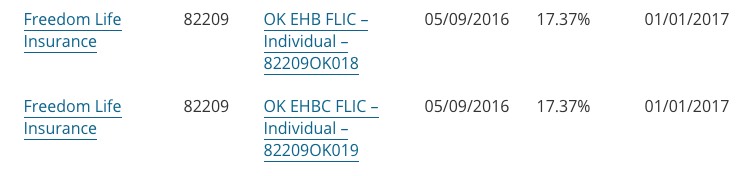 UPDATE x5: Hey, lookee there! Louisiana joins the crowd with filings for both "Freedom Life" and "Enterprise Life", both with exactly 1 enrollee, both asking for exactly 17.37% increases.