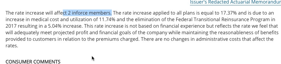 All told, that's at least 11 states, with a grand total of 11 enrollees. 7 out of 11 states are asking for exactly 17.37% hikes. In every case, the actual Actuarial Memorandum is Redacted.