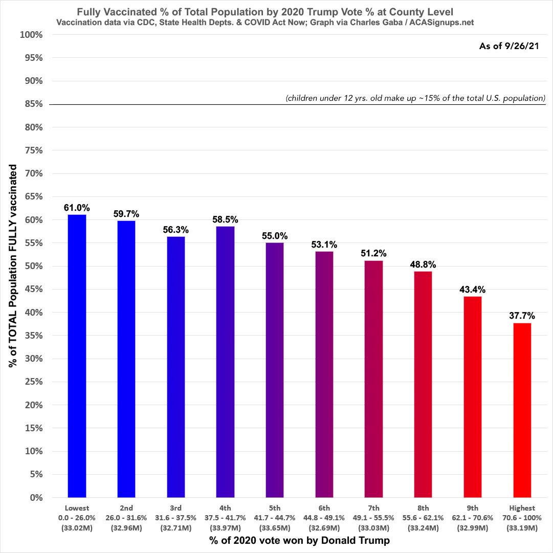 As you can see, the reddest tenth of the population has a vaccination rate 38% lower than the bluest tenth (37.7% vs. 61.0%).