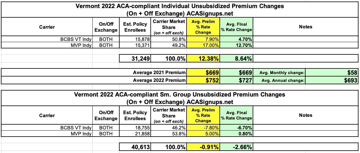 Vermont: Approved avg. 2022 #ACA rate changes: +8.6% indy; -2.7% sm. group; merged markets unmerging!