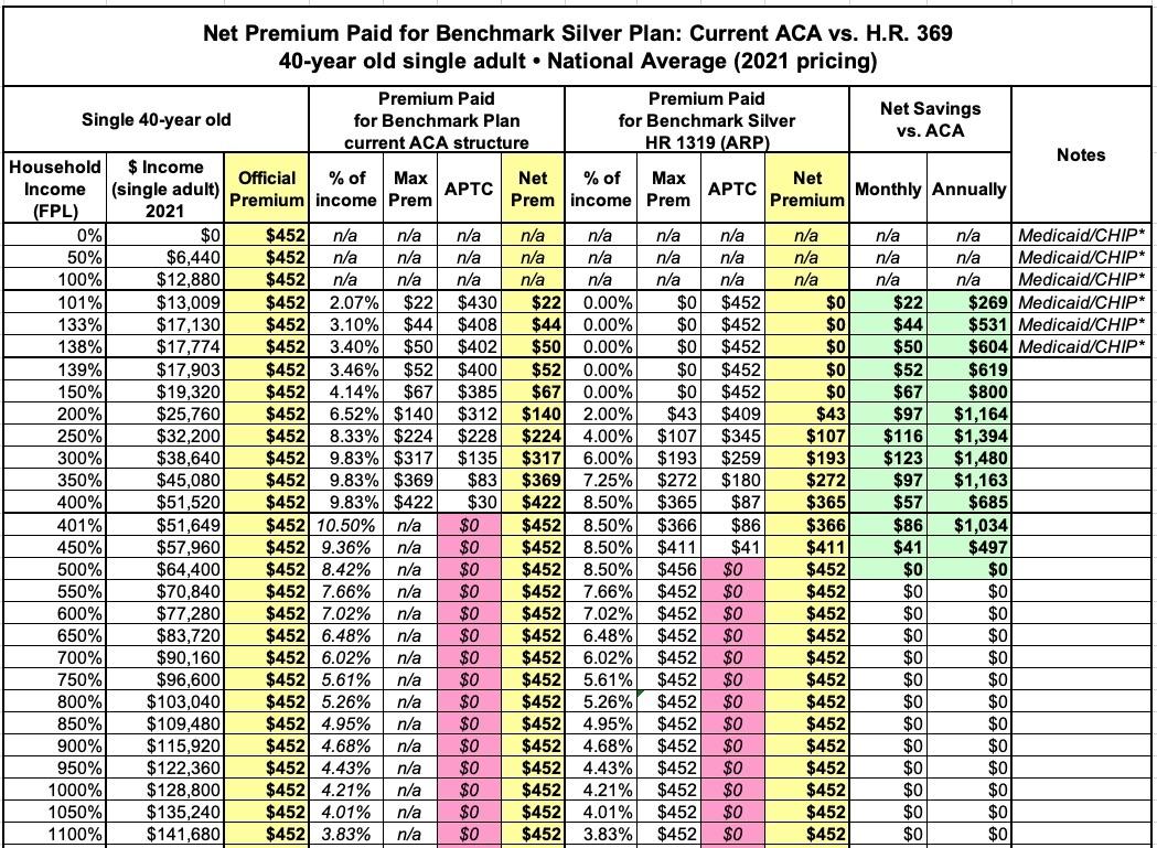 In this version I'm using the actual Advanced Premium Tax Credit (APTC) table under the American Rescue Plan, and I'm cutting out all references to the other two tables to avoid confusion.
