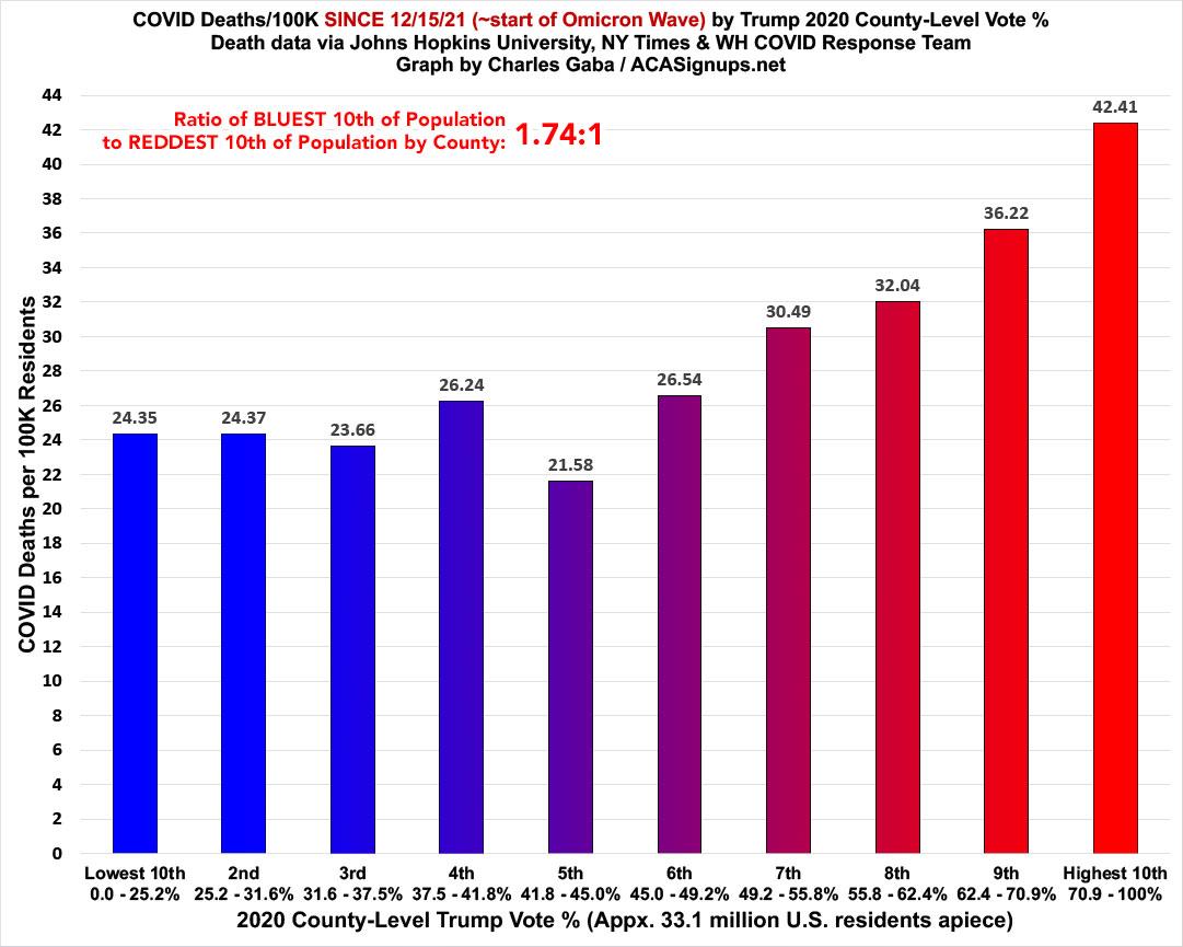 Death rates since Omicron started still swing red, as the death rate in the reddest decile is 1.74x higher than in the bluest. This is down from 2.9x higher a month earlier, however, and down from nearly 5.8x higher during the Delta wave. Remember, deaths tend to lag new cases by about 3 weeks, so it actually makes sense that the two would be shifting in opposite directions at the moment: