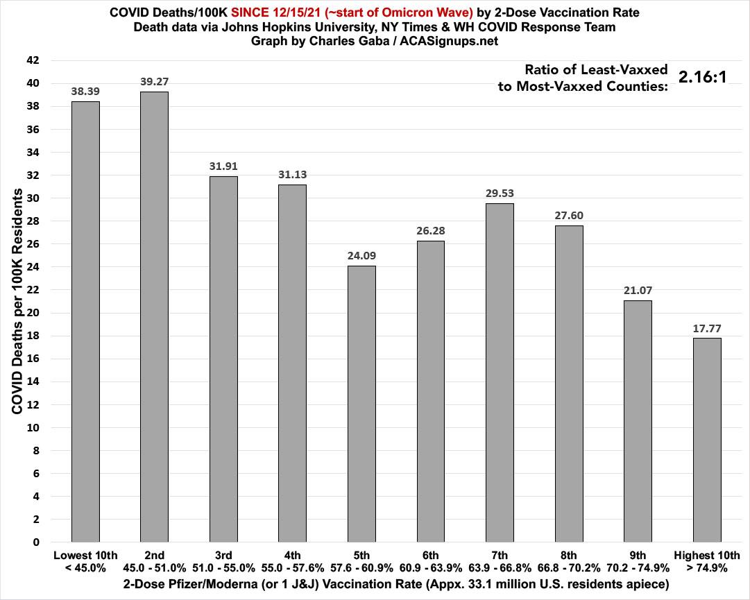 - Delta wave DEATH rates: 4.77x higher in the least-vaccinated decile than the most-vaccinated decile