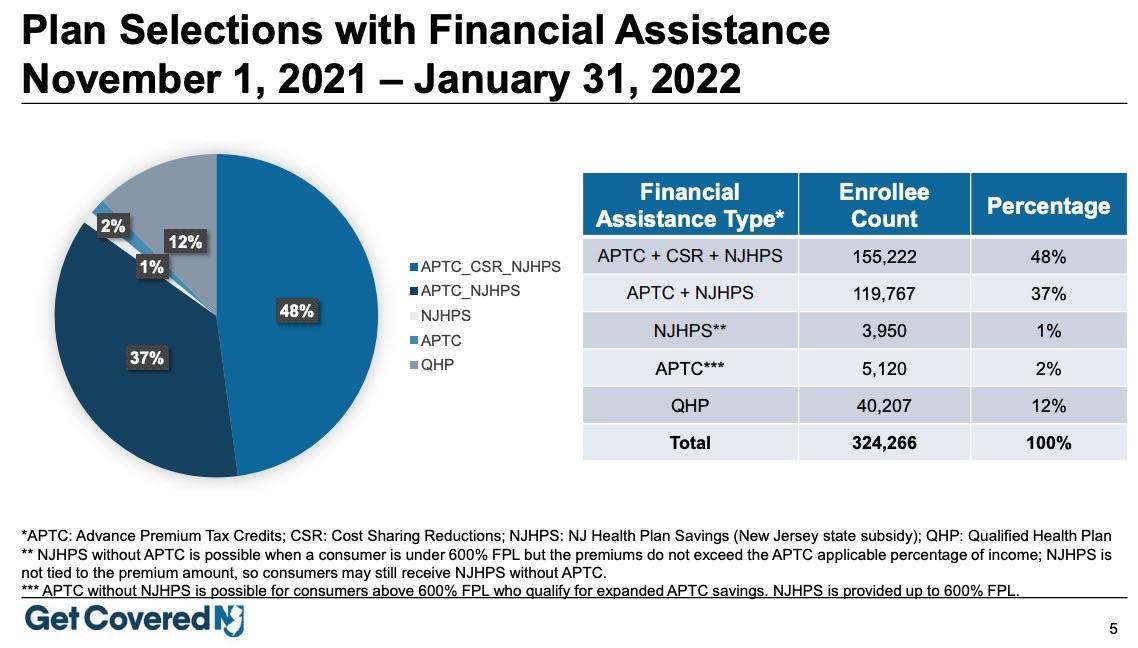 • As of January 31st, 2022, a total of 324,266 residents signed up for 2022 health coverage with Get Covered New Jersey, including more than 123,000 new or existing consumers who actively selected a plan and more than 200,000 who were automatically renewed.