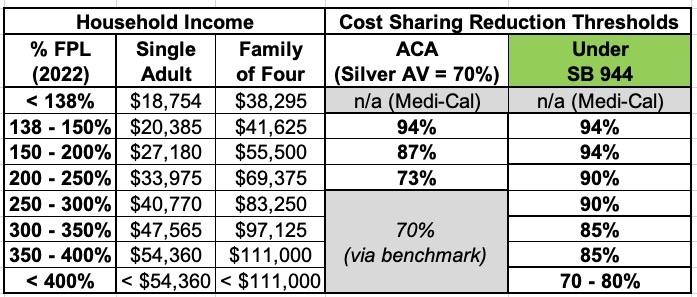 Here's a summary of the ACA's Cost Sharing Reduction subsidy table and how it would change for California enrollees under SB 944: