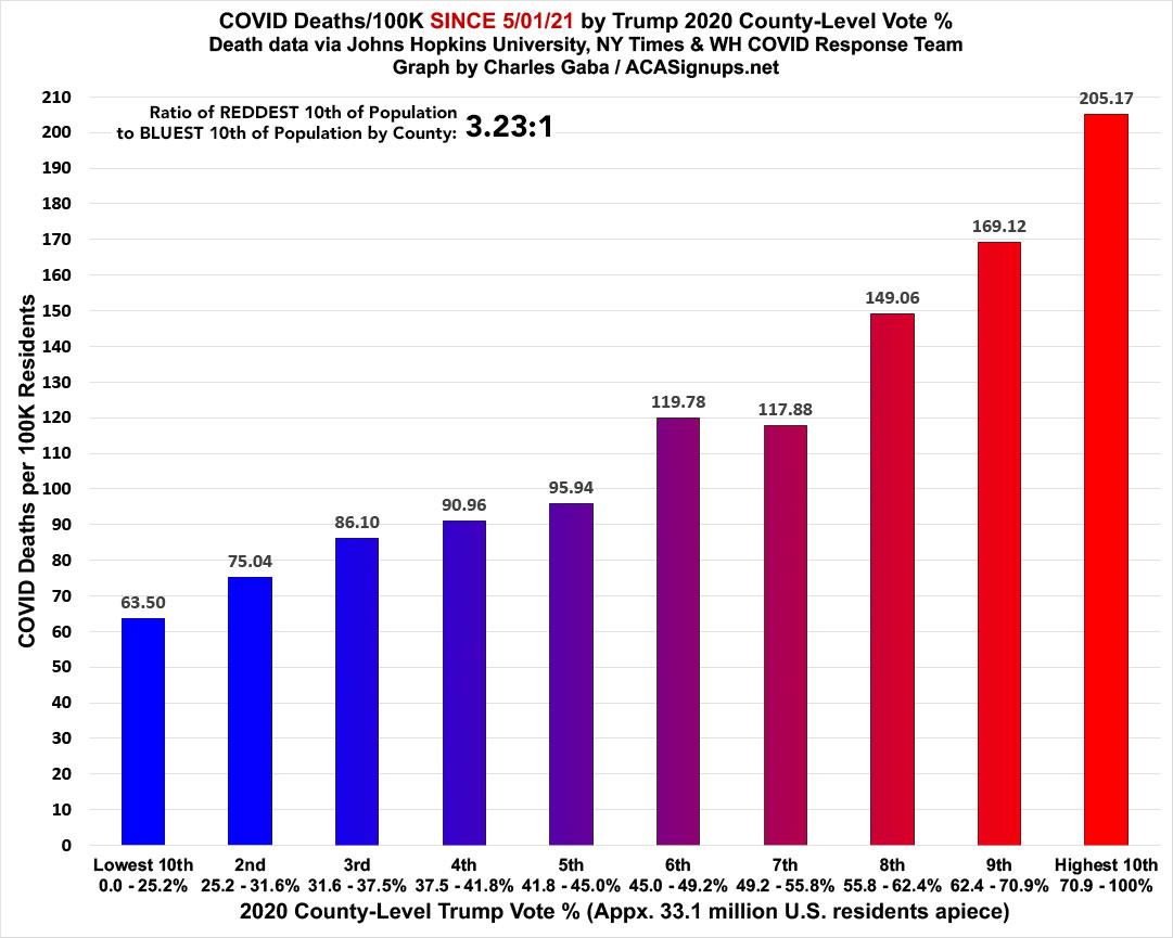 As always, what's even more disturbing is how closely the death rate by partisan lean matches the death rate by vaccination rate; they're virtually mirror images of each other:
