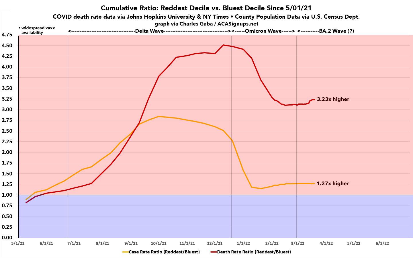The graph below shows how the ratio of case and death rates in the reddest and bluest deciles have changed over time. The gap reached a peak of 4.5x higher at the height of the Delta wave last fall before dropping significantly during the Omicron wave...but since then it's flattened out and is now moving back up again. Note that the sudden bump last week was due to a one-time data adjustment by the Massachusetts Health Dept.: