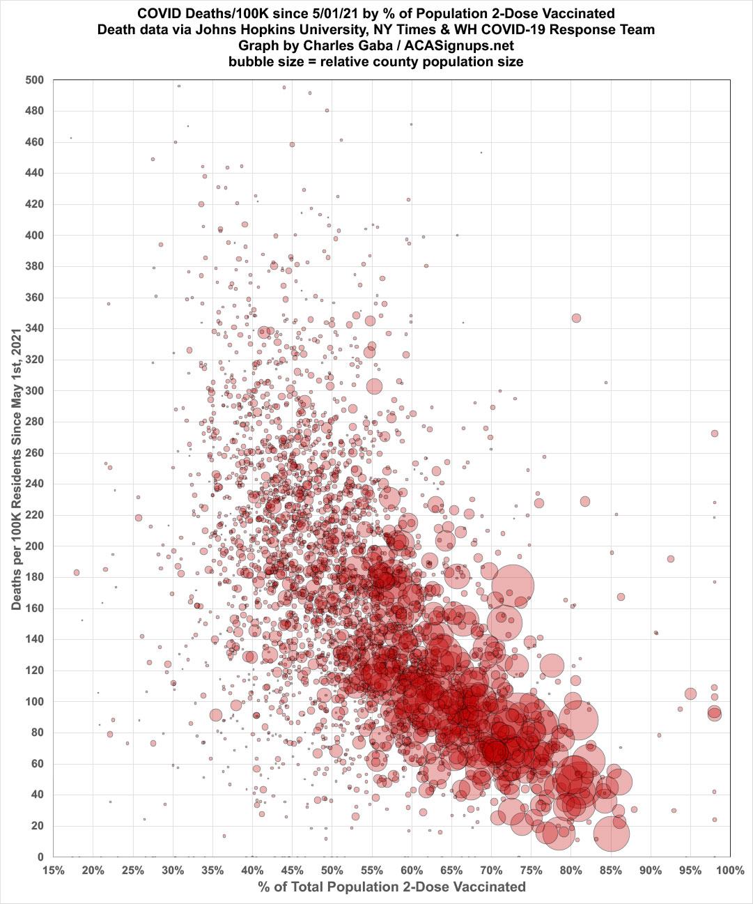 There's still a clear and dramatic correlation between how much of the population has been 2-dose vaccinated and its COVID death rate since last May. The least-vaccinated decile has a death rate 4.0x higher than the most-vaccinated decile. It's important to note that this jumps around a bit from week to week since a few counties move from one decile bracket to the other as vaccination data is bulk-updated: