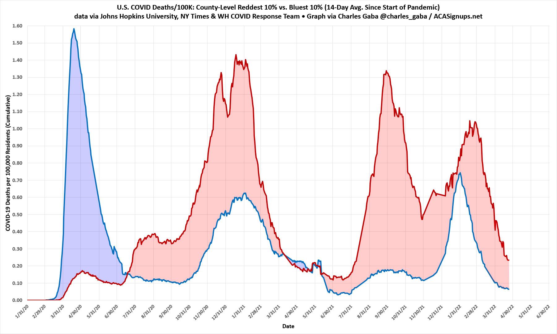 The final graph below shows the 14-day moving average of the death rates in the reddest & bluest deciles, dating all the way back to January 1, 2021. As I predicted back in late December, after reaching near parity in late January, the death rate in the reddest parts of the country has again been 3-4x higher than the bluest parts for several months. Axios recently posted a state-level version of this graph, although in that case they went with states where Trump or Biden won by 15 points or more: