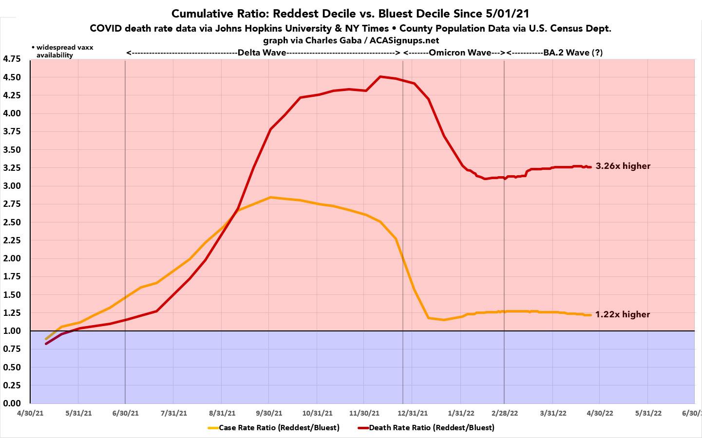 The graph below shows how the ratio of case and death rates in the reddest and bluest deciles have changed over time. The gap reached a peak of 4.5x higher at the height of the Delta wave last fall before dropping significantly during the Omicron wave...but since then it's flattened out and has held relatively steady for the past couple of months, aside from a one-time bump in March 2022 caused by a one-time data adjustment by the Massachusetts Health Dept.: