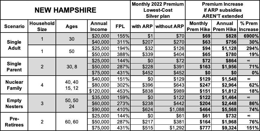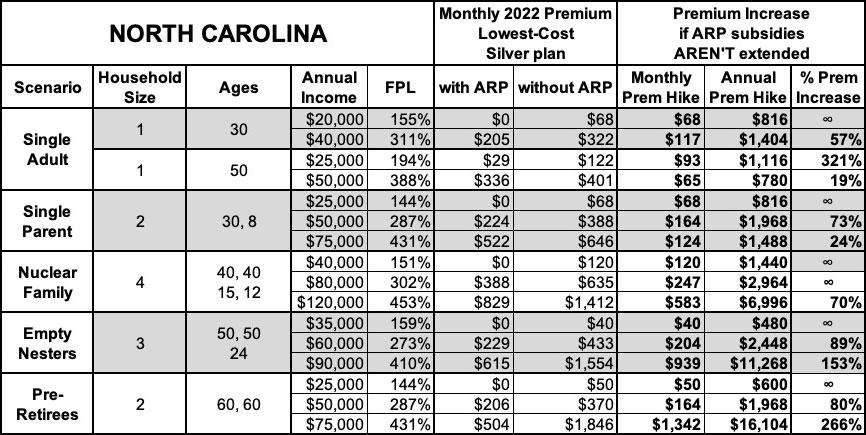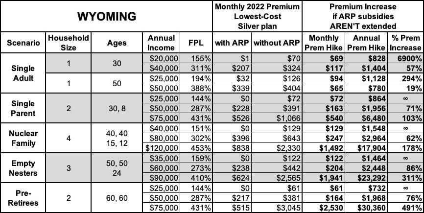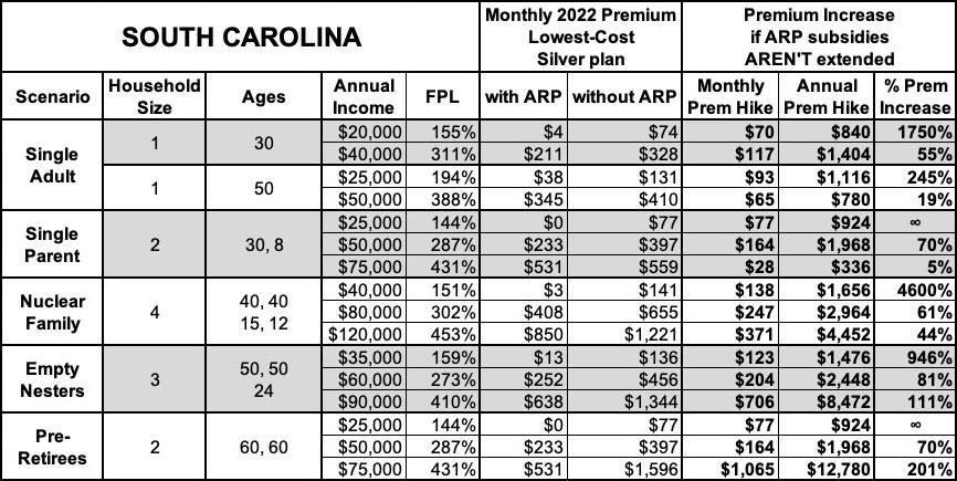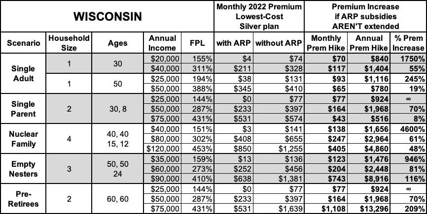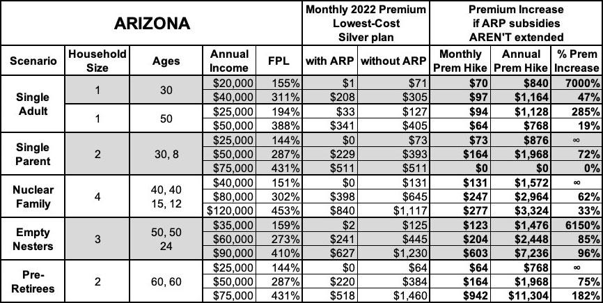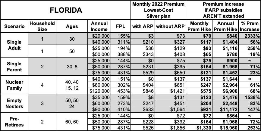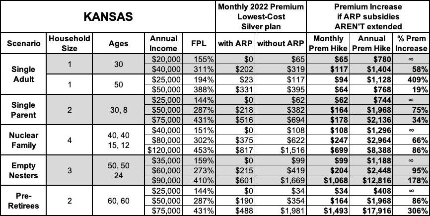 I concluded that, on average, the young adult would have to pay as much as $1,500 more per year; the middle-aged adult would have to pay up to $3,200 more; the family of four would have to pay up to $7,300 more; and the 60-year old couple could potentially be looking at as much as a jaw-dropping $17,000/year premium increase...again, assuming the expanded ARP subsidies aren't extended beyond December 31, 2022.