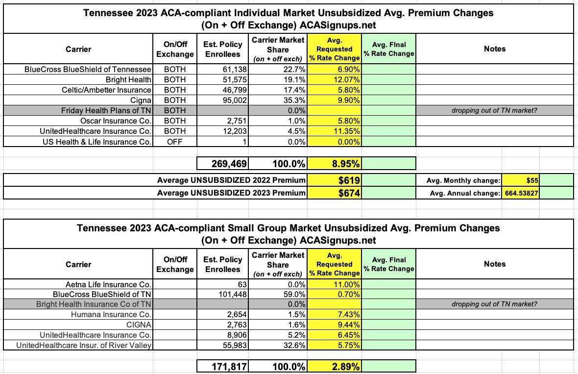 Tennessee: (Preliminary) avg. unsubsidized 2023 #ACA rate changes: +9.0%