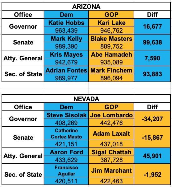 UPDATE 9pm Sunday: Well, most of the races above have been called now; Mark Kelly & Adrian Fontes have won AZ-Senate & AZ-SOS handily, while in Nevada, Gov. Sisolak lost, Francisco Aguilar won by more than the "death cult" margin and it looks like Catherine Cortez Masto did as well, although hers is by far the closest of these (it looks like she ended up winning by perhaps 5,000 votes or so).