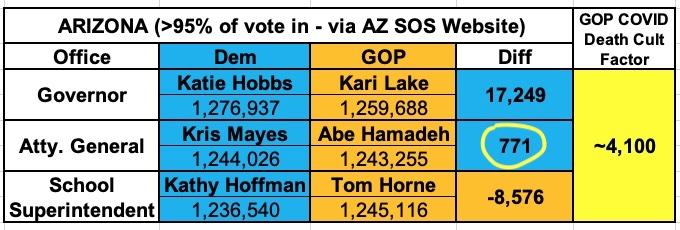 Even then, only one of these (AZ Attorney General) is within my estimate for the net difference between likely Republican and Democratic voters due to COVID deaths between the 2020 & 2022 elections. Mayes is currently ahead by 3,087 votes; if that holds, or she still wins by a smaller amount, then yes, I'd say the red/blue COVID death gap is what ended up pushing her over the top.