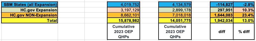 The table below shows actual, official OEP enrollment including BHP enrollees in both FFM & SBM states for every year since 2014. For 2023 I'm using my projected final 2023 OEP QHP + BHP numbers, which should be perhaps ~3% higher nationally than the hard numbers reported yesterday. I've also listed the states which have shifted between FFM & SBM status, which complicates proper year-over-year comparisons a bit...except that there were no changes in FFM/SBM status between 2022 and 2023.