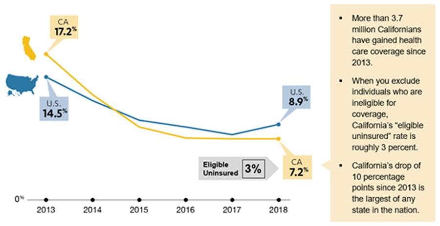 - Since 2013, California has reduced its uninsured rate by more than any other state in the nation has by expanding Medi-Cal, investing in marketing and outreach and keeping costs low for consumers.