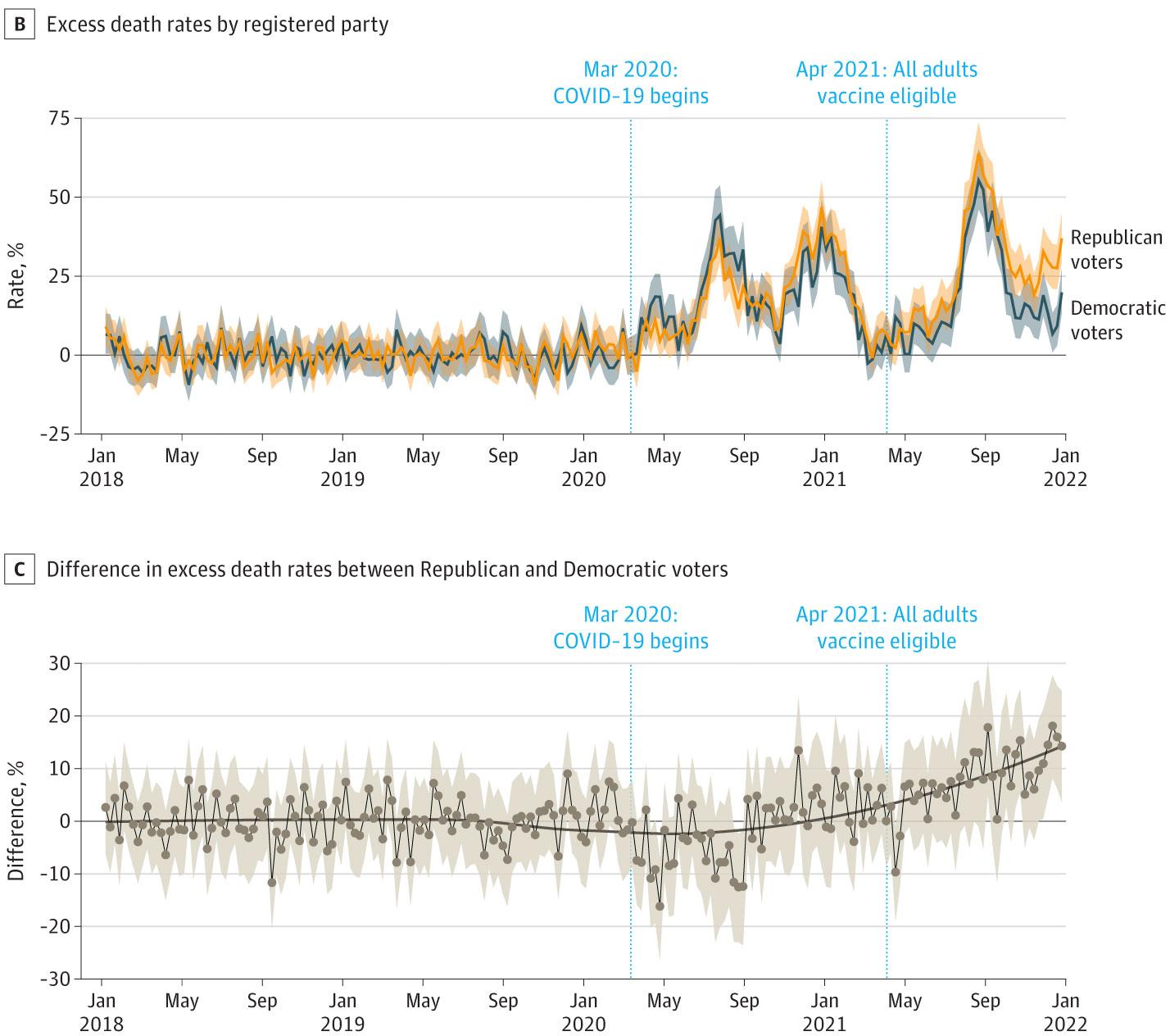 ...In this cohort study evaluating 538 ,159 deaths in individuals aged 25 years and older in Florida and Ohio between March 2020 and December 2021, excess mortality was significantly higher for Republican voters than Democratic voters after COVID-19 vaccines were available to all adults, but not before. These differences were concentrated in counties with lower vaccination rates, and primarily noted in voters residing in Ohio.