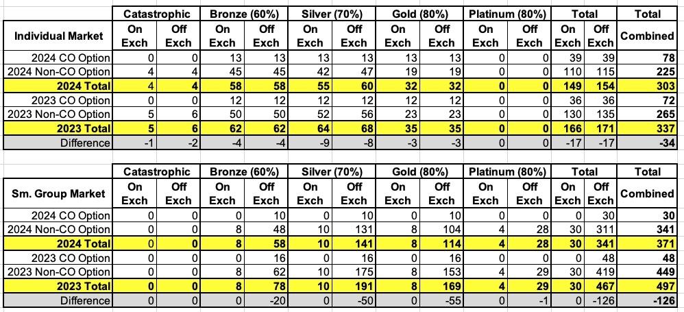 Update: Correction, apparently I misread that about Anthem; they have the same total number of plans available after all...not sure how I messed that up; apologies. Their Rocky Mountain division is offering off-exchange policies only, abut aren't listed on CO DARA's summary for whatever reason.