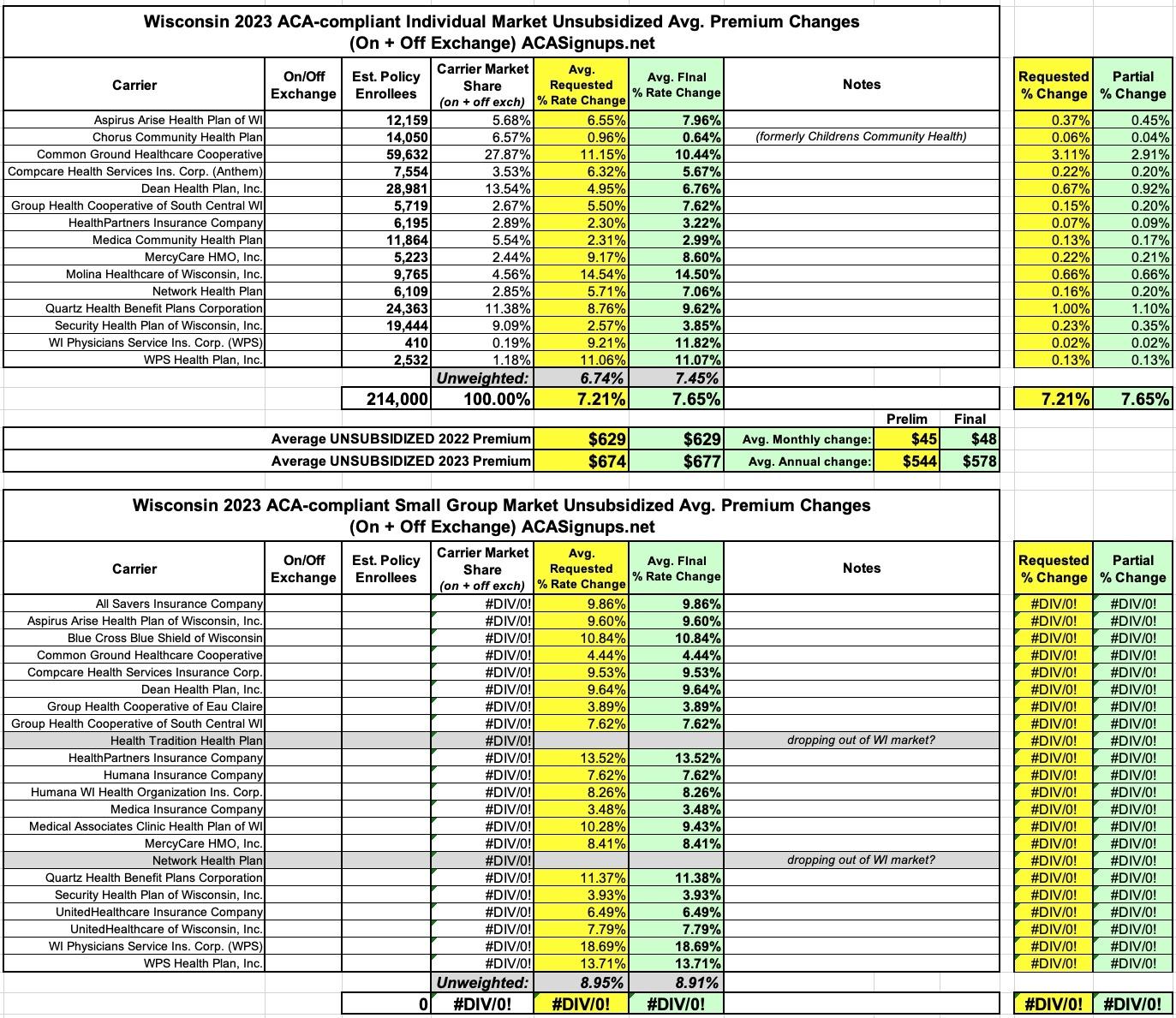 Wisconsin: Final avg. 2023 #ACA rate changes: +7.7%