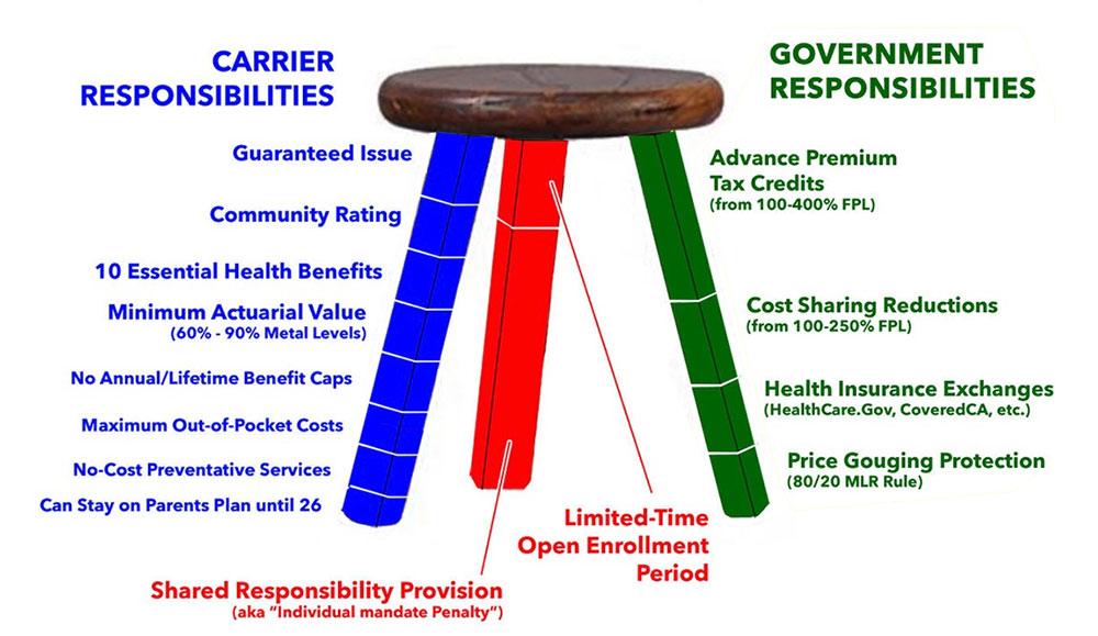 Look, the bottom line is this: The "3-Legged Stool" graphic below depicts how the ACA originally intended the individual market to look. Over the years there have been numerous changes to the Red Leg (zeroing out of the individual mandate penalty) and the Green Leg (upgrading/expanding the APTC subsidies & replacement of CSR reimbursements with "Silver Loading" in many states). Some of these changes have been positive, some negative. But the Blue Leg--the "Patient Protection" part of the law--has (for the most part) remained pretty much intact.