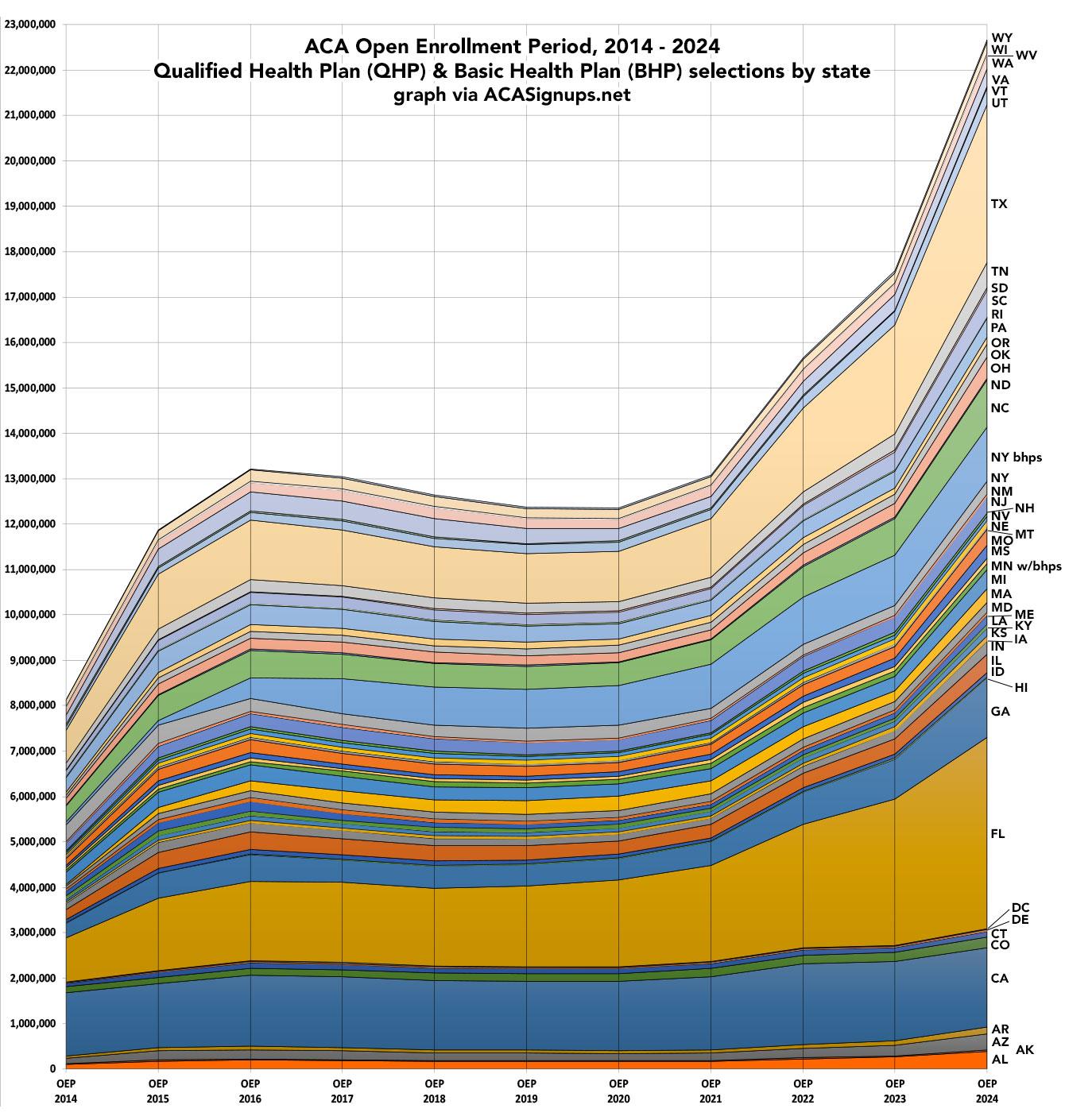 There's still likely up to perhaps ~25,000 or so Qualified Health Plan (QHP) enrollments to be added to the 2024 Open Enrollment Period (OEP) tally from the states which haven't reported their final, post-1/16 enrollments (in fact, CA & NY technically haven't ended theirs yet, but I decided to throw this together today for the hell of it.