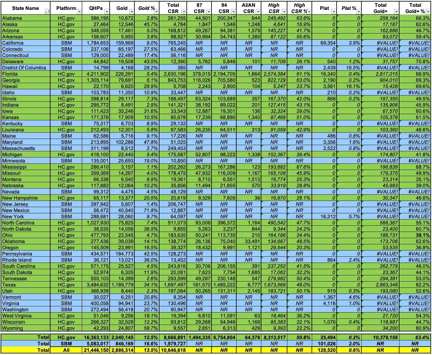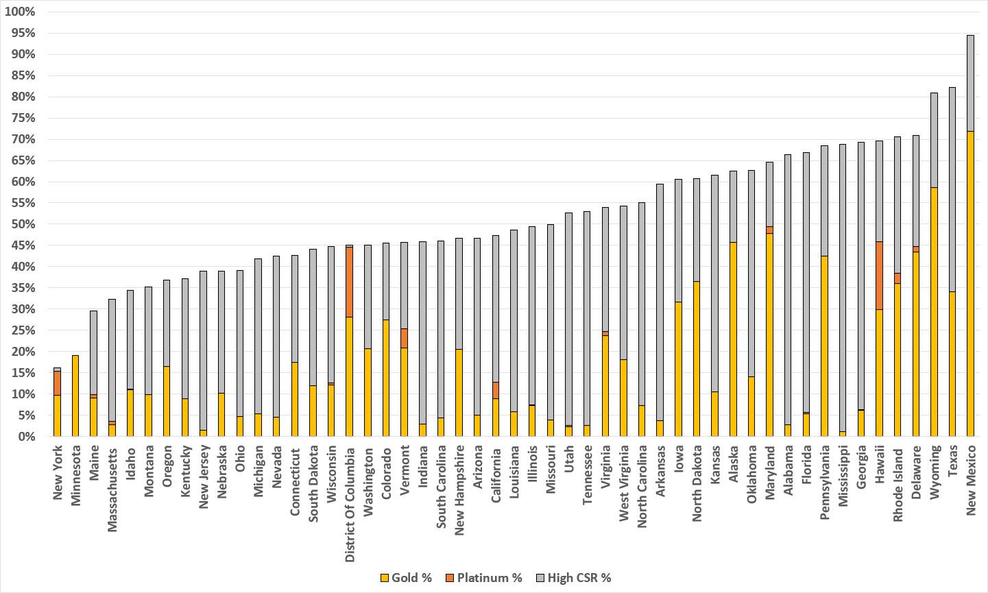 As for Vermont and Washington's supplemental subsidy programs, they mostly apply to premiums, not cost sharing, so while their Gold-or-Better numbers are likely slightly higher, I don't think it's more than a percent or two at most.