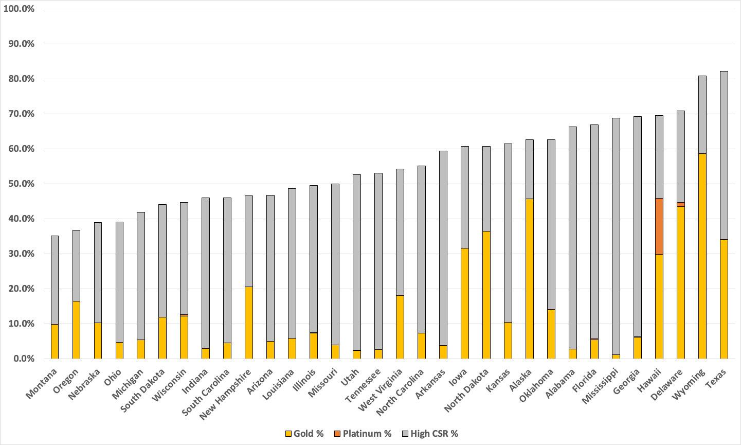 With this in mind, I decided to figure out just what percent of ACA enrollees in each state have "Gold or Better" coverage. This includes enrollees with actual Gold or Platinum plans along with those in high-CSR Silver plans (ie, not including the nominal 73% AV population).