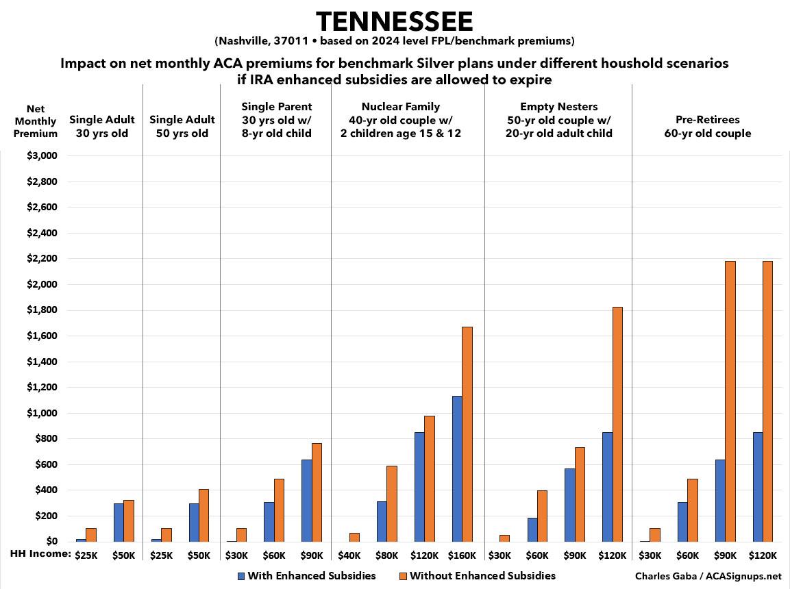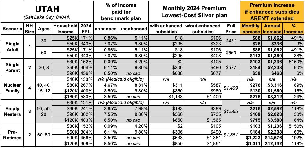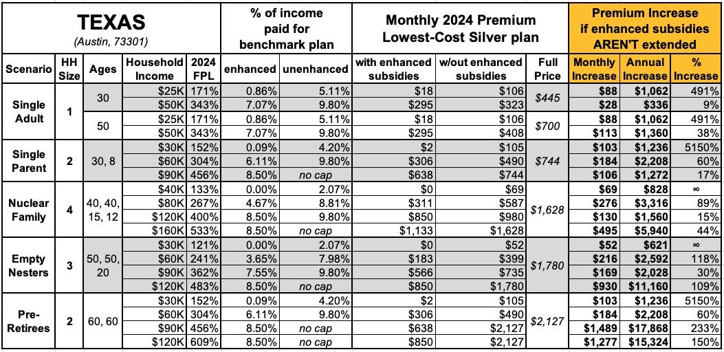 That's the macro level, however. As I did a couple of years ago when the subsidies were originally at risk of expiring in 2023, I decided to run the numbers myself to get an idea of just how much enrollees real-world health insurance premiums would go up in the event the ARPA/IRA subsidies are indeed allowed to expire at the end of next year.